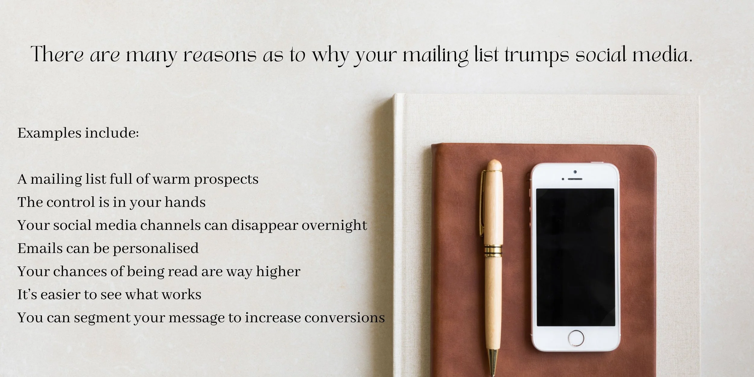Why is your mailing list so important? A mailing list is the best way to build strong relationships with potential customers. Compared to social media, a mailing list is more intimate, allowing you to connect with them one to one and be right there in their inbox.